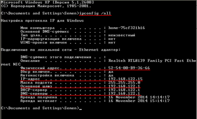 Для этого, мы, используя один из рассматривавшихся выше способов, узнаем выданные нашему компьютеру/ноутбуку адреса DNS сервера и основного шлюза,