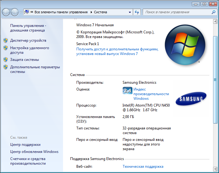 Окно "Свойства системы" в Windows 7