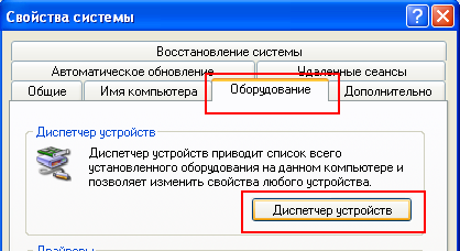 вкладка "Оборудование" -> кнопка "Диспетчер устройств"